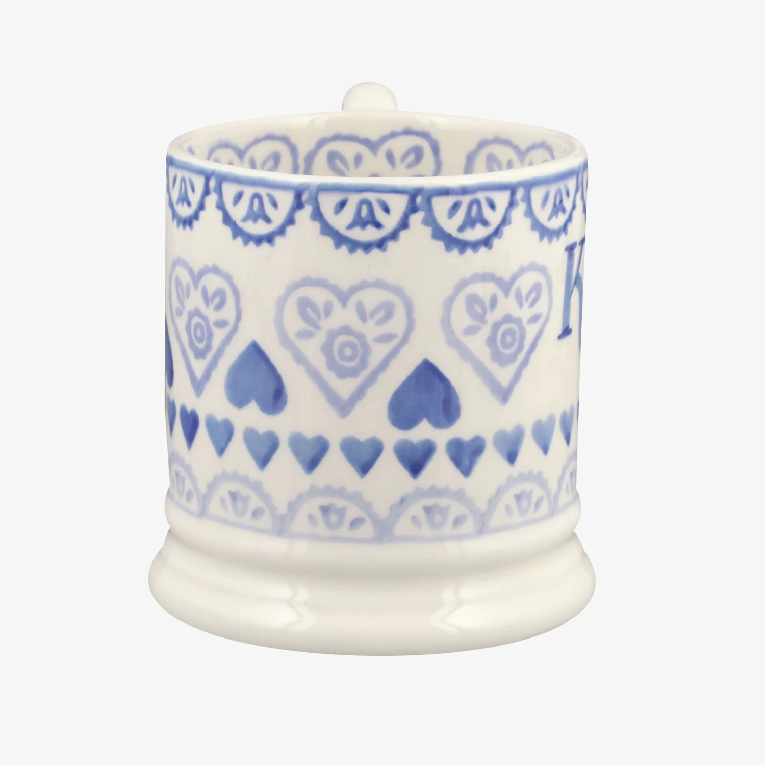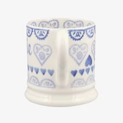 The pattern on this Personalised Blue Sampler 1/2 Pint Mug is inspired by some of Emma’s Victorian spongeware pieces, while the message written on it comes from you. Simply choose what you’d like us to script on the piece and leave the rest to us. All our pottery is handmade and hand-decorated in our factory in Stoke on Trent. Like this pattern but looking for a different shape? Choose a different piece from our Personalised Blue Sampler collection.