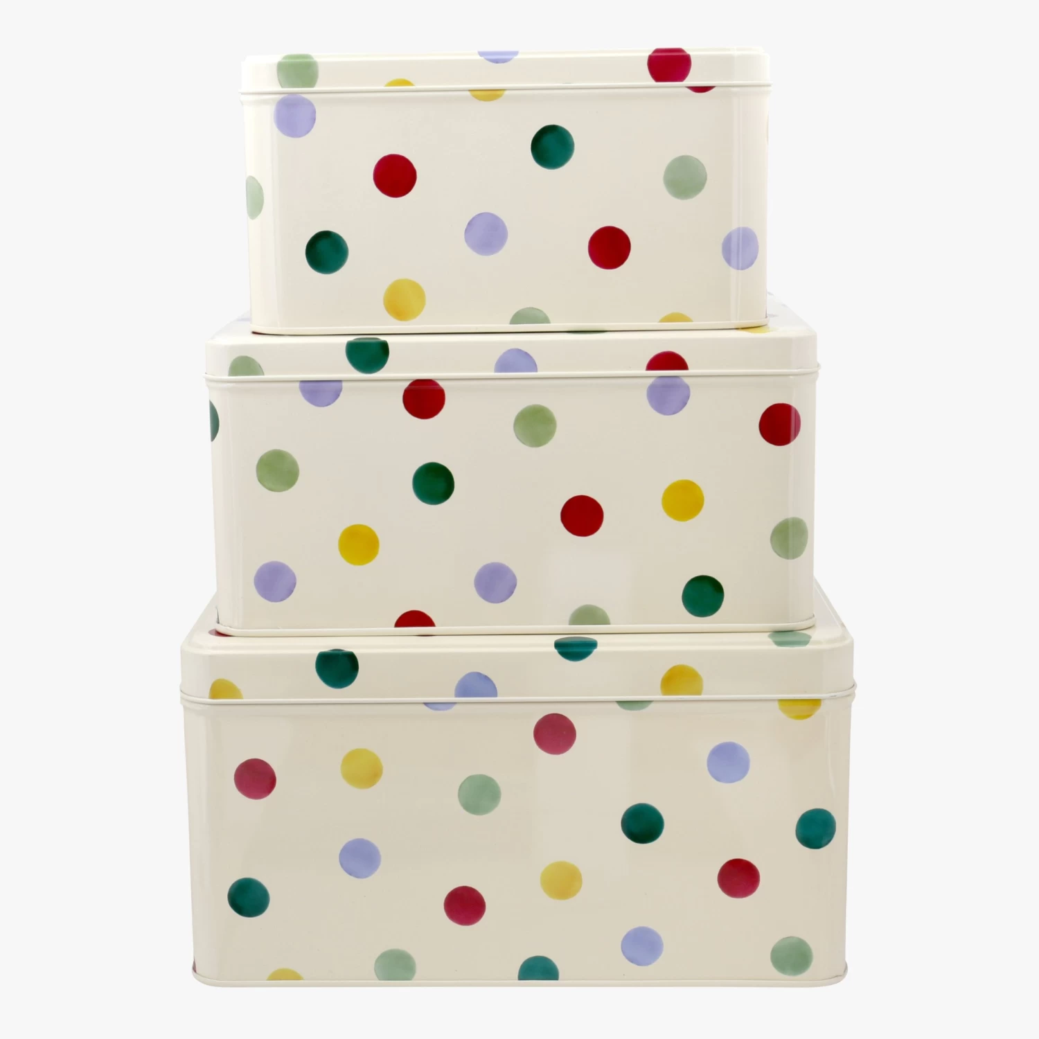 Wondering how to store the tiers of that freshly baked wedding cake? We have the answer: an Emma Bridgewater Polka Dot Set of 3 Square Cake Tins.
